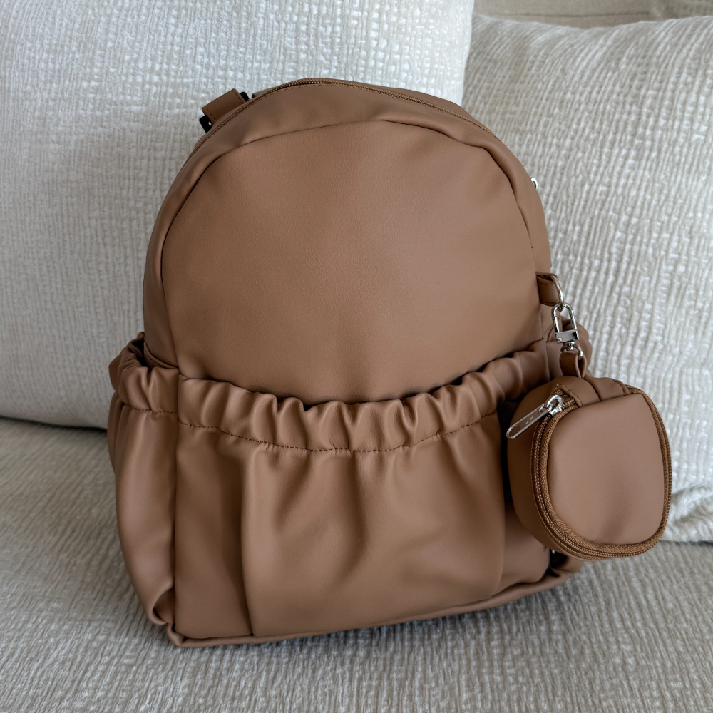 כתפיות הגב מתכווננות לנוחות מירבית, וכלל הרצועות בצבע בז' חום.